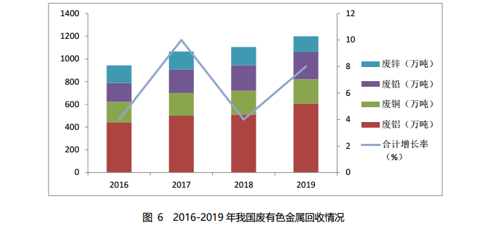 國內(nèi)方面,隨著我國有色金屬社會蓄積量的持續(xù)增加以及相關制品報廢高峰的臨近,廢有色金屬回收量將持續(xù)增加。但受疫情影響,加工行業(yè)階段性停工停產(chǎn),生活報廢品回收受阻,新廢料和舊廢料回收均將受到較大影響,綜合預測 2020年廢銅、廢鋁、廢鉛和廢鋅整體回收量較2019年變化不大。