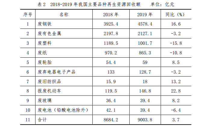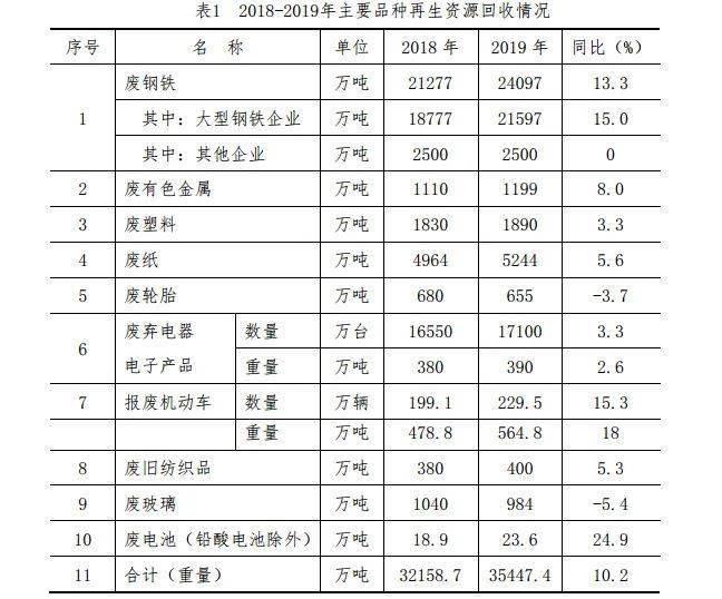 2019年,我國再生資源回收企業(yè)約10萬家,回收行業(yè)從業(yè)人員約1500萬人。截至2019年底,廢鋼鐵、廢有色金屬、廢塑料、廢輪胎、廢紙、廢棄電器電子產(chǎn)品、報廢機動車、廢舊紡織品、廢玻璃、廢電池十大品種的回收總量約3.54億噸,同比增長10.2%。2018-2019年主要品種再生資源回收情況如表1所示。