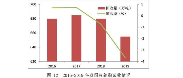 2019年,我國汽車輪胎產(chǎn)量為6.5億條,其中國內(nèi)消耗約3.8億條。2019年,廢輪胎回收利用企業(yè)約1500家,從業(yè)人員約10萬人,回收量約2億條,回收重量約655萬噸,同比下降3.7%。其中,輪胎翻新量約500萬標準折算條,再生橡膠產(chǎn)量約300萬噸,橡膠粉產(chǎn)量約100萬噸,熱裂解處理量約100萬噸。2016-2019年我國廢輪胎回收情況如圖12所示。