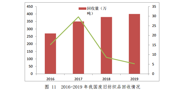 2019 年,我國棉、化纖和絲三類紡織纖維加工量約6610萬噸。據(jù)估算,每年產(chǎn)生廢舊紡織品超過 2000 萬噸,一類是消費前工業(yè)加工領域的邊角料等,基本得到再生利用,另一類是閑散在居民手中的大量廢舊衣物和紡織品,再生利用率約 15%。2019年,我國廢舊紡織品回收量約為 400 萬噸, 同比增長 5.3%。2016-2019年我國廢舊紡織品回收情況如圖 11 所示。