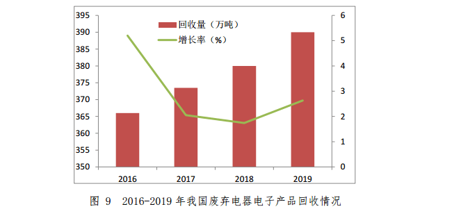 截至 2019 年底,全國共有 29 個?。▍^(qū)、市)的 109 家廢棄電器電子產(chǎn)品拆解處理企業(yè)納入廢棄電器電子產(chǎn)品處理基金補貼企業(yè)名單,電視機、微型計算機、洗衣機、電冰箱和空氣調(diào)節(jié)器的回收量約 17100 萬臺,報廢重量超過390萬噸。2016-2019 年我國廢棄電器電子產(chǎn)品回收情況如圖9所示。