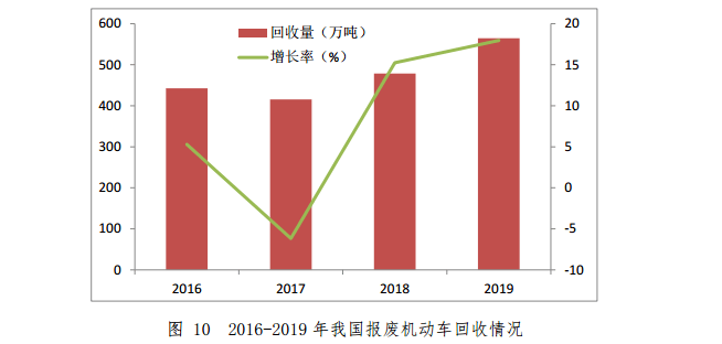 截至2019年底,我國報廢機動車回收拆解企業(yè)共755家,回收網(wǎng)點約2271個,從業(yè)人員約2.4萬人。2019年,機動車回收數(shù)量為229.5萬輛,同比增長15.3%,其中汽車195.1萬輛,同比增長16.8%;摩托車34.4萬輛,同比增長7.1%。按照車輛類型分,客車回收量為138.7萬輛,同比增長17.1%;貨車45.3萬輛,同比增長18.9%;掛車5.5萬輛,同比增長29.3%;專項作業(yè)車2.8萬輛,同比下降1.4%。2016-2019年我國報廢機動車回收情況如圖10所示。