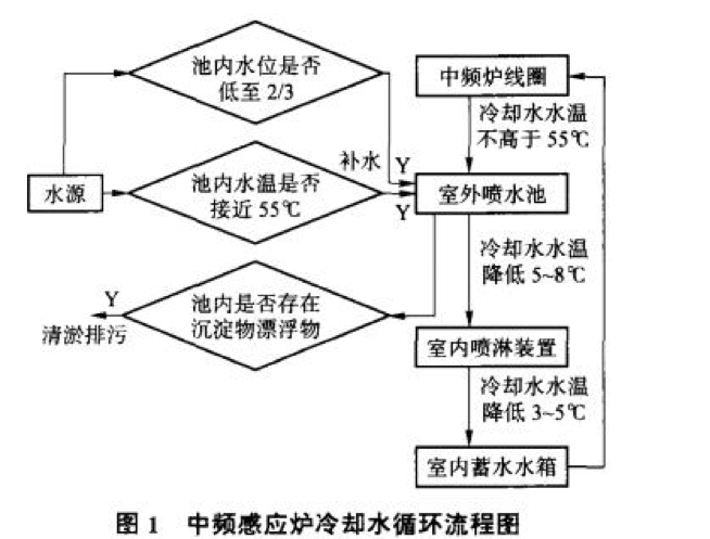 該冷卻系統(tǒng)以潛水泵為動力,噴水池和噴淋架為兩級冷卻裝置,以達(dá)到中頻爐冷卻水循環(huán)使用的目的。當(dāng)水溫超過中頻爐冷卻要求<(55℃)及水量蒸發(fā)損失較多時,則由補水管路及時補充,同時及時排污,保持清潔?!鋮s水池還可為噴水池周邊綠地灌溉,使水資源得到綜合利用。