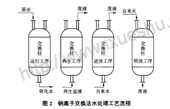 針對上述問題,采取了下列解決辦法引入去除了鈣鎂離子的軟化水來冷卻中頻爐。常用的水處理工藝是鈉離子交換法見圖,其原理是用樹脂中的鈉離子將水中容易結(jié)垢的鈣鎂離子置換出來,減少結(jié)垢,提高換熱效率。用酸洗劑加緩蝕劑清洗中頻爐線圈、管路和噴淋架,去除水垢。檢修水泵、閥門和管路,治理泄漏。