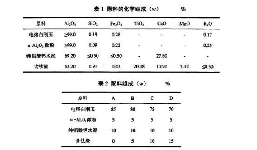 試驗用主要原料為電熔白剛玉、活性葉舢203微粉、純鋁酸鈣水泥、含二氧化鈦工業(yè)渣以及AC.H.Z200 等有機(jī)添加劑,其化學(xué)組成如表l所示。