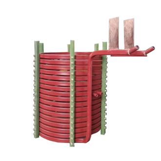 中頻爐感應(yīng)線圈是由螺旋狀矩形紫銅管、固定膠木柱、銅螺釘、連接排以及冷卻水路組成。這其中通過變頻電流產(chǎn)生磁場為螺旋狀矩形紫銅管。因此,中頻爐感應(yīng)線圈的功能就是使得中頻電流通過中頻爐螺旋形感應(yīng)線圈產(chǎn)生磁場,中頻爐感應(yīng)線圈內(nèi)部磁場大小和分布范圍由感應(yīng)線圈設(shè)計所決定的,也就是說與中頻爐感應(yīng)線圈的矩形銅管尺寸、匝數(shù)、感應(yīng)線圈直徑有很大關(guān)系。